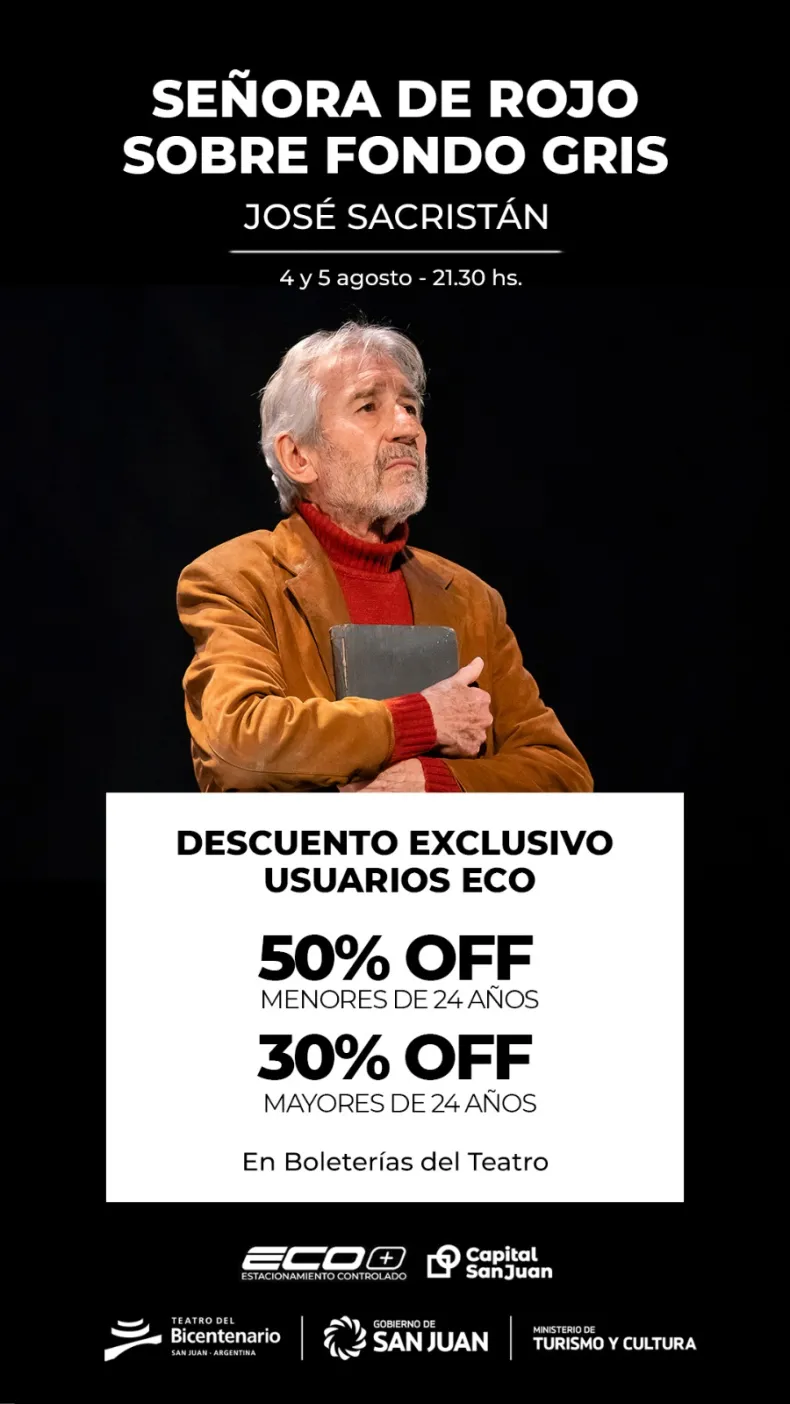 Durante dos jornadas los sanjuaninos disfrutarán de una muestra más de la rica cultura nacional e internacional. En esta oportunidad será el estreno de la aclamada obra del actor español José Sacristán, "Señora de rojo sobre fondo gris".