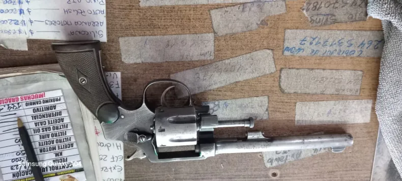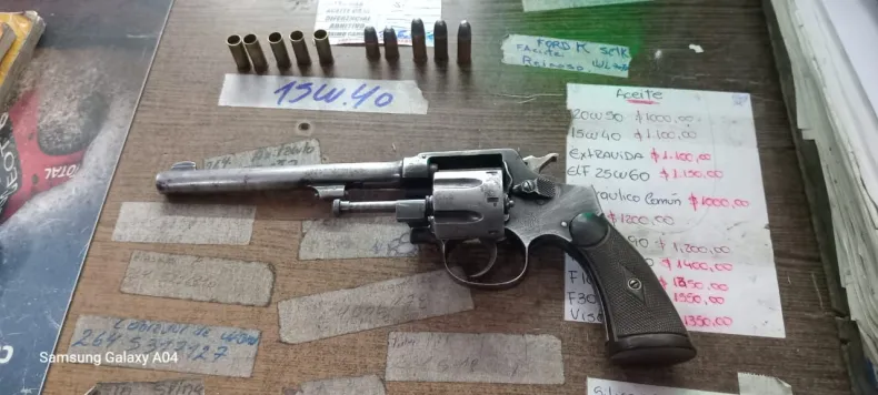 Al realizarle el palpado los investigadores le encontraron entre sus pertenencias un revólver calibre 32 largo con la inscripción (H), con cachas de madera, apto para el disparo, por lo que se continuo con una minuciosa requisa en el lubricentro. Además se encuentra sobre un armario seis (6) vainas servidas y cinco (5) municiones de calibre 32.