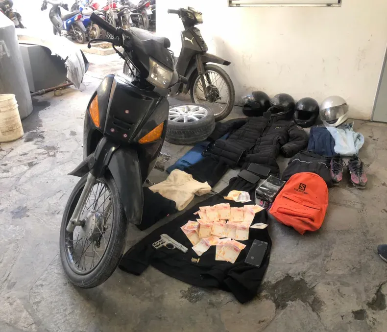 Tras varios días de trabajo investigativo y posterior allanamiento, las pesquisas lograron secuestrar parte del dinero en efectivo, las prendas de vestir usadas por los ladrones, una réplica de arma de fuego plateada, municiones calibre 22 y 32, varios teléfonos celulares y dos motos 110cc.