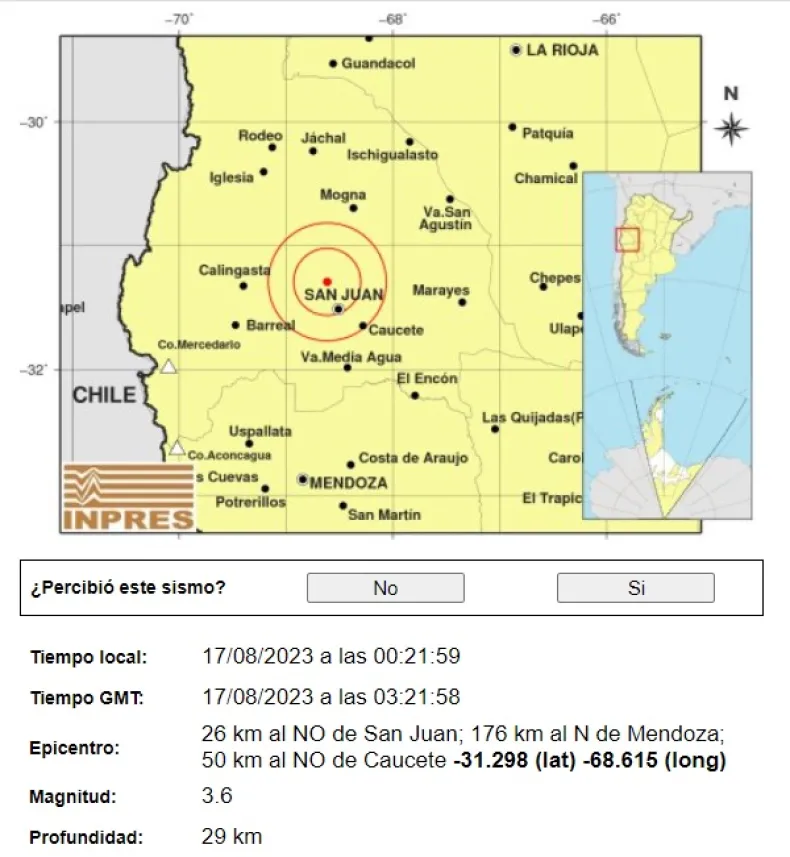 Según los datos publicados por el Instituto Nacional de Prevención Sísmica, el movimiento se produjo a las 00.22, con epicentro a 26 kilómetros al noroeste de San Juan y tuvo una magnitud de 3.6 grados.