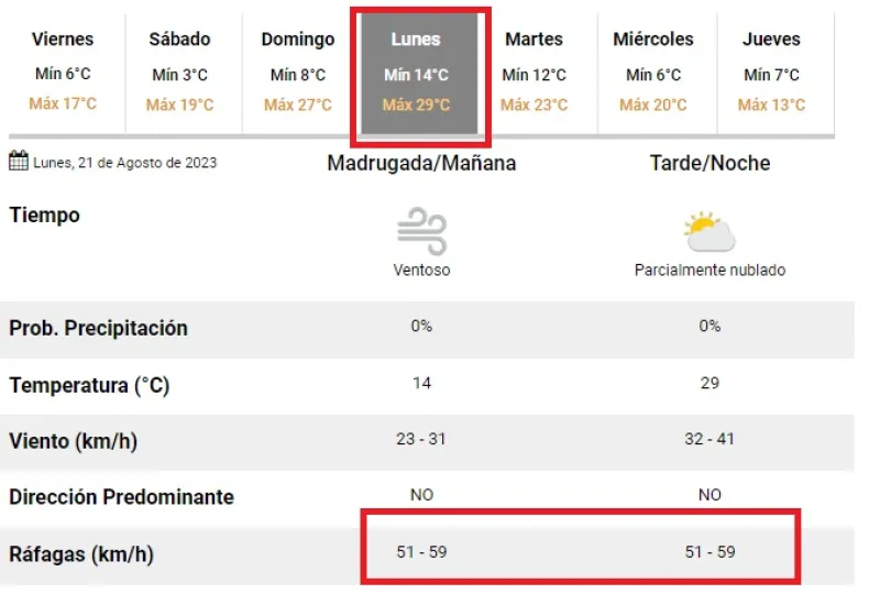A raíz de estas nevadas, se prevé un viento intenso proveniente del sector norte en las zonas llanas de San Juan durante el sábado, domingo e incluso el lunes, donde espera que las ráfagas de viento alcancen velocidades de entre 51 y 59 kilómetros por hora.
