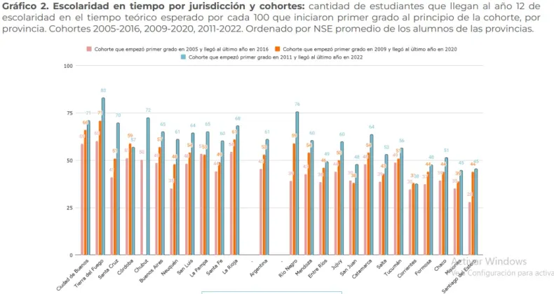 Por otro lado, se detallata que Tierra del Fuego (83%), Río Negro (76%) y Chubut (72%) tienen la mayor proporción de alumnos que llegan al último año de la educación obligatoria en el tiempo esperado. En el otro extremo se ubican las jurisdicciones de Corrientes (38%), Misiones (45%) y Santiago del Estero (45%).