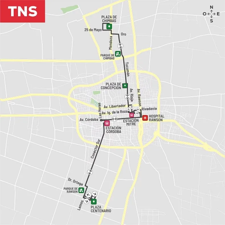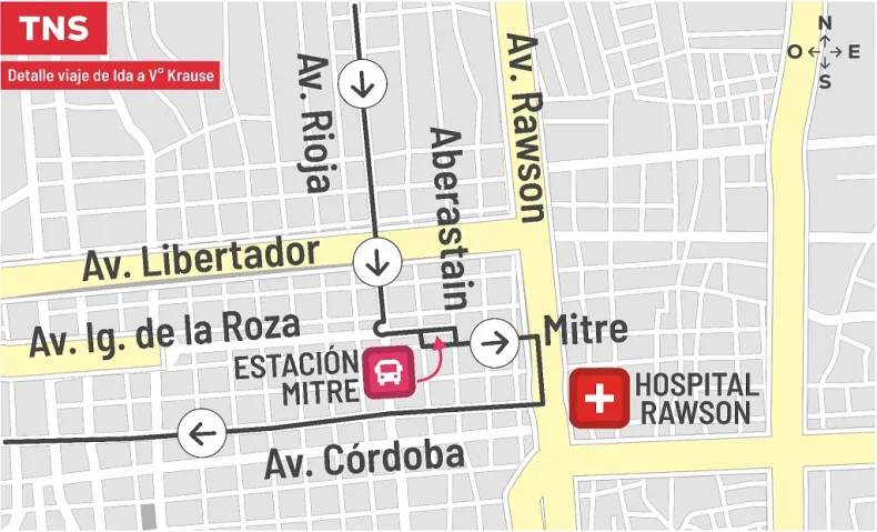 Se trata de la Línea TNS (Troncal Norte-Sur) de la empresa El Triunfo. Ahora, las unidades circularán por Av. Rioja, Av. José Ignacio de La Roza, Aberastain, Estación de Transbordo Mitre, Jujuy, Av. José Ignacio de La Roza, Aberastain, Mitre, Av. Dr. Guillermo Rawson, Av. Córdoba, continuando su recorrido habitual.