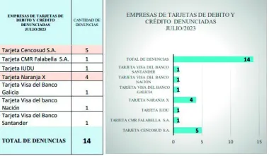 En el caso de los bancos las denuncias se deben entre muchas otras cosas, por jemplo, a baja de tarjeta que nunca solicitó ni recibió; no es cliente del banco; solicitud de baja de tarjeta, anulación de deuda y libre de deuda; por compras en dólares que desconoce; solicicitud por reintegro de lo que abonó y que le den de baja a las tarjetas.