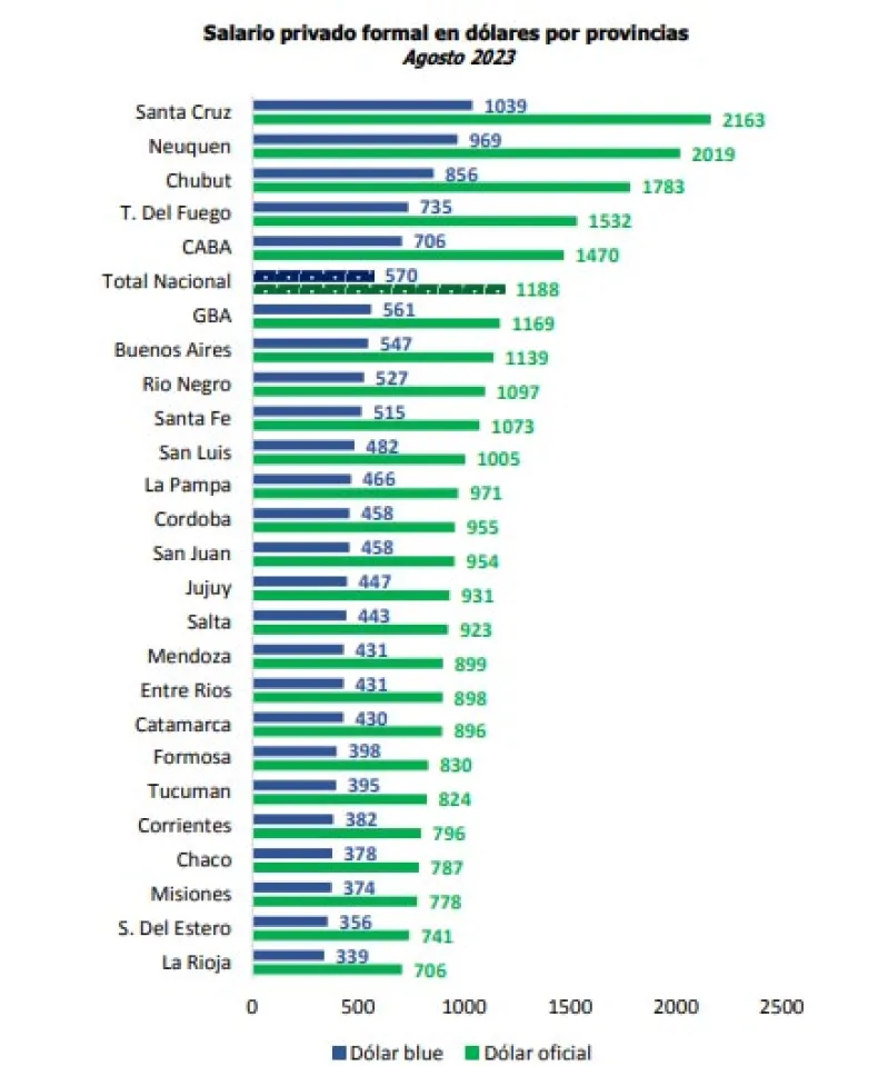Un informe de la Fundación Mediterranea indica que segregando por jurisdicción se puede obtener un panorama de las heterogeneidades que rigen en Argentina. Tanto al dólar oficial como al dólar paralelo, son 4 provincias patagónicas las que mandan en el ranking de mayores salarios en el sector privado formal: Santa Cruz (US$ 1.039 al paralelo, US$ 2.163 al oficial), Neuquén (US$ 969 y US$ 2.019), Chubut (US$ 856 y US$ 1.783) y Tierra del Fuego (US$ 735 y US$ 1.532). La Ciudad Autónoma de Buenos Aires se encuentra a continuación, en el quinto lugar, con US$ 706 al blue y US$ 1.470 al oficial.