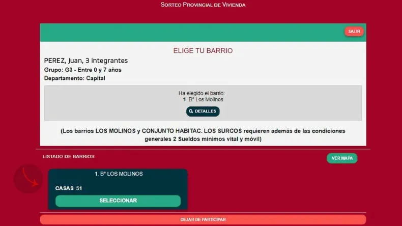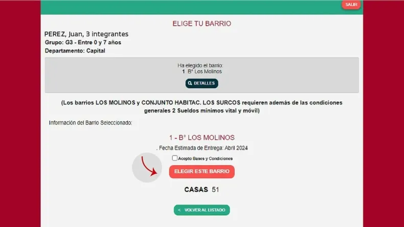 Definido el barrio para participar, el/la postulante deberá aceptar las bases y condiciones y seleccionar la opción Elegir este barrio.