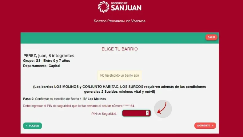 El sistema solicitará que el/la postulante indique su número de celular y enviará un PIN de confirmación. De ese modo, la elección de barrio estará correctamente realizada.