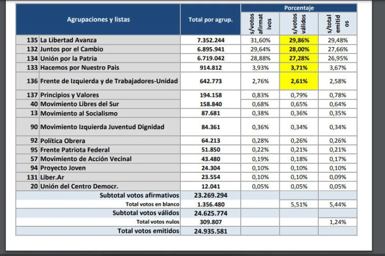 En tanto, Unión por la Patria, la coalición oficialista que tiene a Sergio Massa como aspirante al sillón de Rivadavia, sumó 27,28 por ciento (6.719.042 votos).