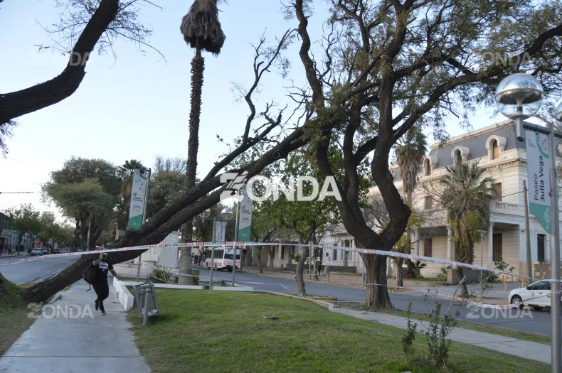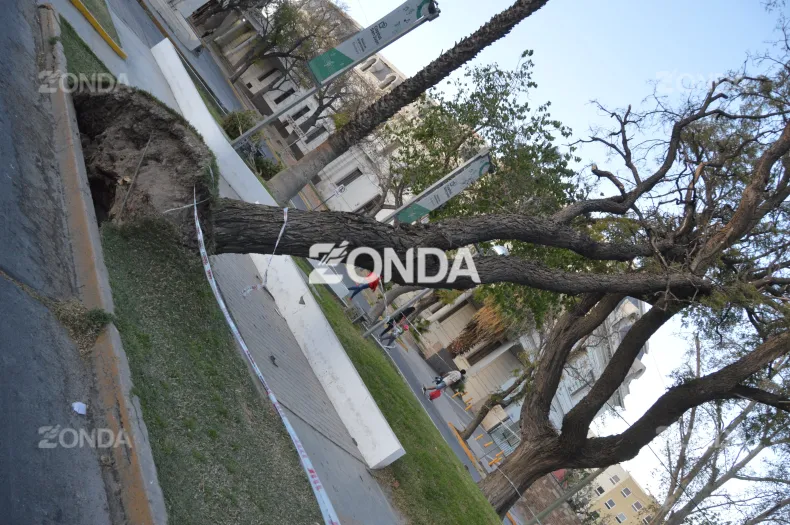 En este contexto, un árbol grande ubicado en la intersección de avenidas Rawson y Córdoba se cayó. Se trata de un ejemplar de Tipuana tipu ubicado en el paseo que hay sobre el boulevard de Avenida Rawson, justo frente al Hospital Rawson, en la zona más antigua.