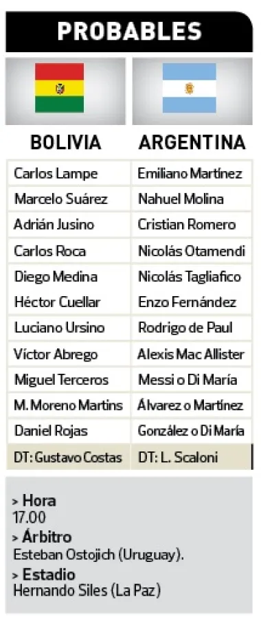 La principal duda pasa por la presencia de Messi, quien pidió el cambio sobre el final de la victoria ante el conjunto ecuatoriano y, si bien los estudios descartaron una lesión y pudo viajar a La Paz, Scaloni no confirmó si será titular o si ocupará un lugar en el banco de los suplentes.