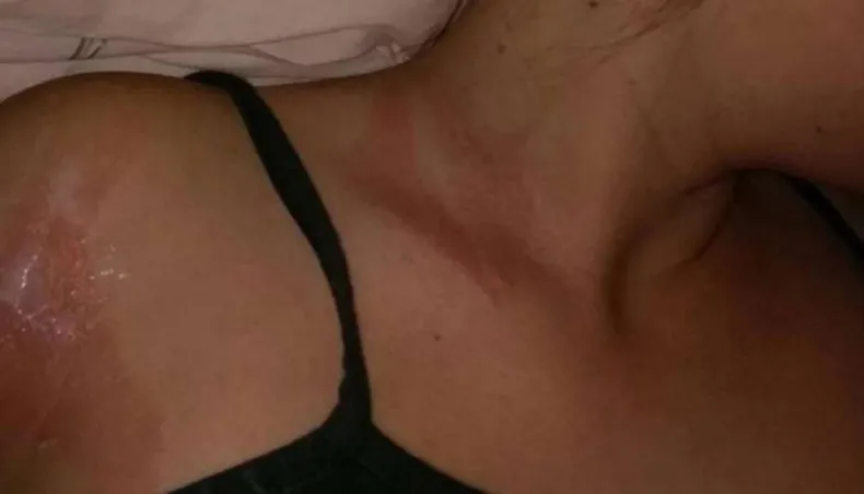 Luego la mujer violenta intentó clavarle un cuchillo tramontina. Pero eso no es todo. Tomó un termo con agua caliente y le arrojó toga el agua en el pecho, produciéndole lesiones en toda la parte del tórax y estómago.