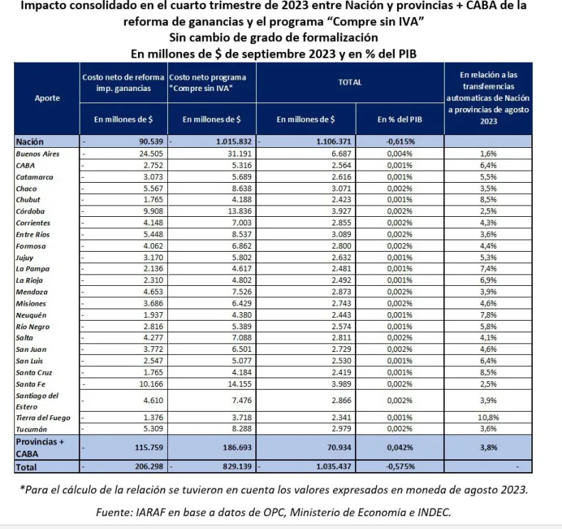 Dado que por la reforma de ganancias las provincias y CABA perderían 0,06% del PIB de acá a fin de año, si el sistema de "Compre sin IVA" se aplicara plenamente, saldrían ganando 0,04% del PIB, dado que por el reintegro cobrarían un extra de 0,11% del PIB por mayor recaudación.