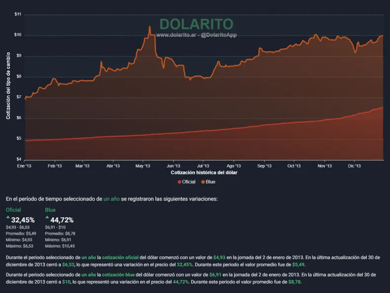 La página especializada marca que durante el año 2013 la cotización oficial del dólar comenzó con un valor de $4,93 en la jornada del 2 de enero y en la última actualización del 30 de diciembre de 2013 cerró a $6,53, lo que representó una variación en el precio del 32,45%. Durante este periodo el valor promedio fue de $5,49. Si se toma en consideración la cotización del 22 de septiembre el valor era de 5.73 pesos.