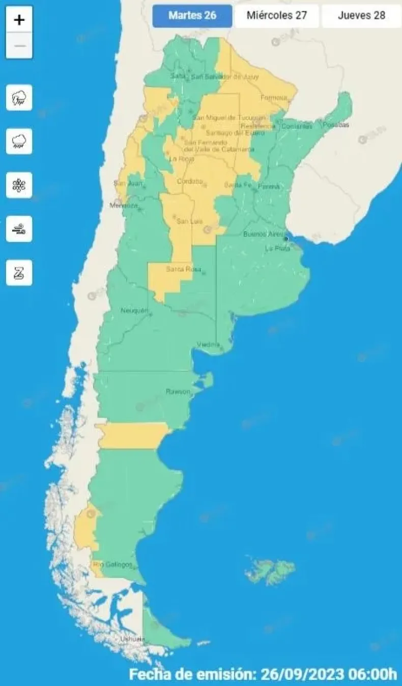 Se trata de un alerta amarillo dividido en varias regiones con diferentes alcances. Por una parte, para zonas de las provincias de Salta, Formosa, Chaco, Santa Fe, Santiago del Estero, Catamarca, La Rioja, Córdoba, San Luis y La Pampa; por otro para las zonas cordilleranas de Catamarca, La Rioja y San Juan; y por último para el sur de la provincia de Chubut.