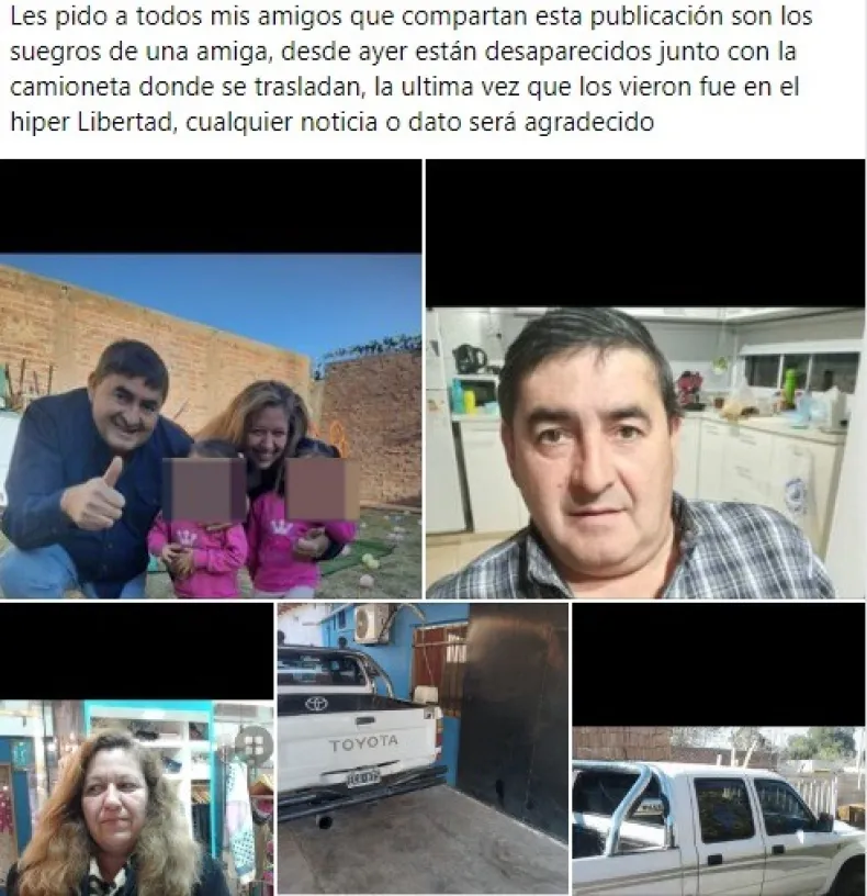 Fueron vistos por última vez este domingo en el Híper Libertad, cerca de las 13 horas. El matrimonio se movilizaba en una camioneta de color blanca.