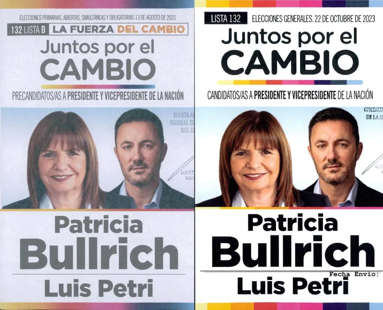 La única boleta que se mantiene sin cambios en su diseño en comparación con las PASO es la de Patricia Bullrich, la candidata de Juntos por el Cambio. En su caso, solo se han actualizado los detalles obvios, como la fecha de las elecciones y su título de "precandidata".