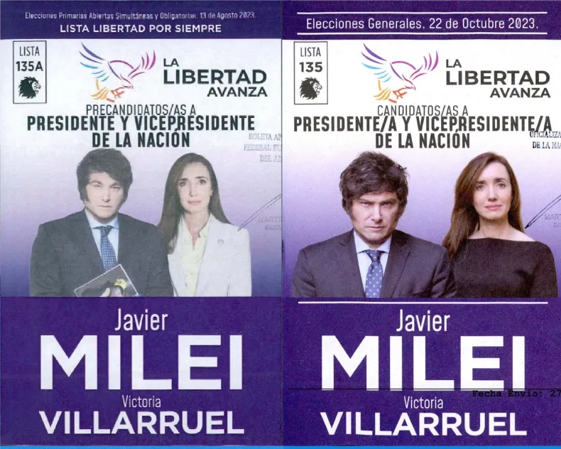 Por otro lado, La Libertad Avanza ha mantenido la estructura de colores y tipografía, pero ha mejorado significativamente la calidad de las imágenes de su binomio, compuesto por Javier Milei y Victoria Villarruel. Milei aparecerá con una mirada desafiante y sin objetos en las manos, mientras que su compañera lucirá un vestido negro en lugar de un traje blanco.