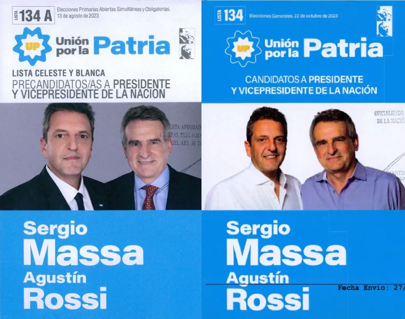 Unión por la Patria, liderada por Sergio Massa, también ha realizado cambios notables en su boleta. Las imágenes de Massa y su compañero de fórmula, Agustín Rossi, muestran a ambos más relajados, vistiendo simplemente camisas en lugar de trajes, con Massa en blanco y Rossi en celeste. Además, se han invertido algunos colores y se han colocado en una posición más prominente las figuras de Perón, Evita y Néstor Kirchner.