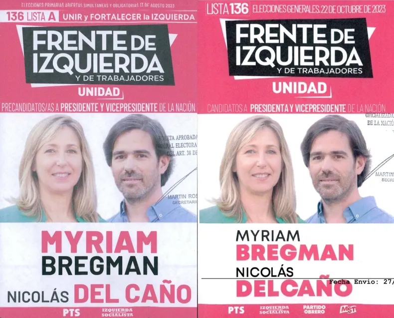 Finalmente, el Frente de Izquierda y de Trabajadores-Unidad (FIT-U) ha mantenido la foto de sus candidatos con algunas pequeñas modificaciones en la tipografía y los colores utilizados para los nombres.
