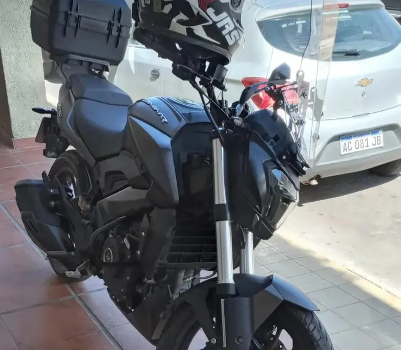 Se trata de una Dominar 250 cc de color negro, patente A 142 LWA, con parabrisas y con baulera del mismo color.