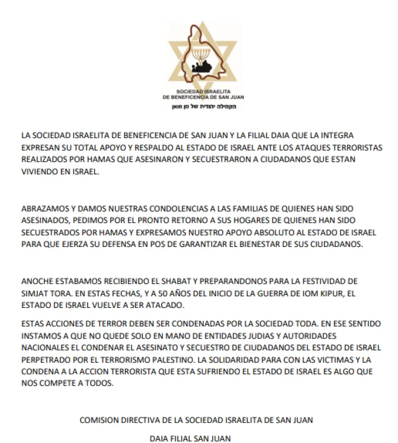 En un comunicado conjunto, la Sociedad Israelita de Beneficencia de San Juan y la Filial DAIA, que la integra, manifiestan su total respaldo y apoyo al Estado de Israel en medio de los ataques terroristas perpetrados por Hamas, que han resultado en asesinatos y secuestros de ciudadanos que residen en Israel.