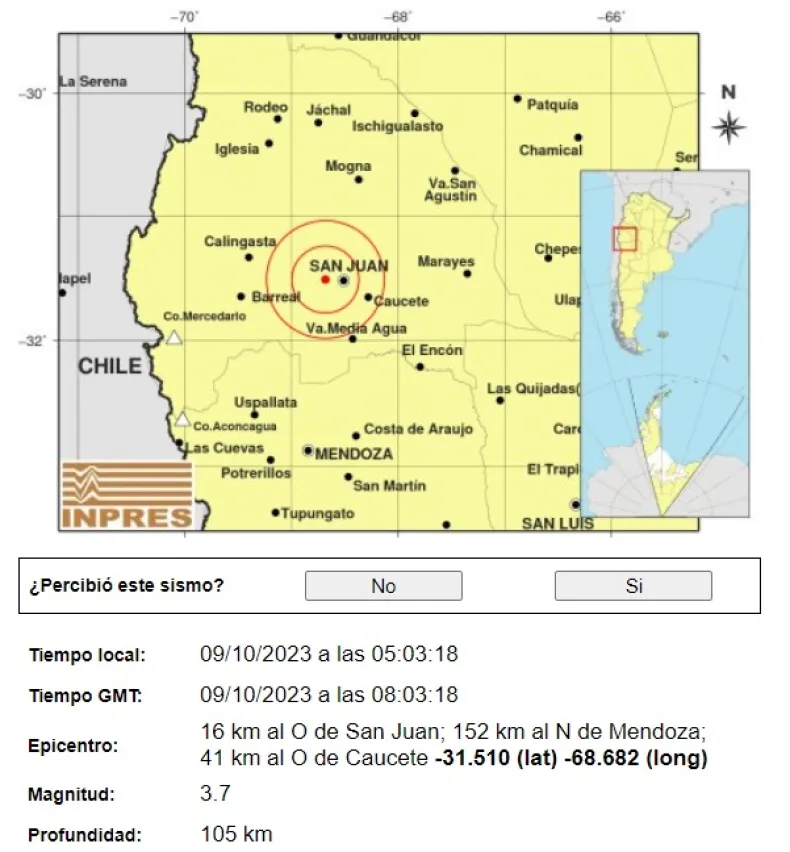 Este lunes por la madrugada, el Instituto Nacional de Prevención Sísmica informó sobre un sismo percibido en la provincia.