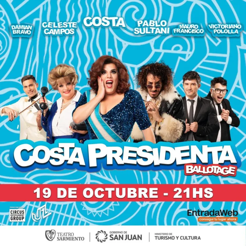 El próximo jueves 19de octubre, en el Teatro Sarmiento, desde las 21 horas, se presenta en San Juan "Costa Presidenta Ballotage" . Se trata de una puesta escénica humorística dirigida por Roberto Peloni que sacará carcajadas a espectadores de diferentes edades.