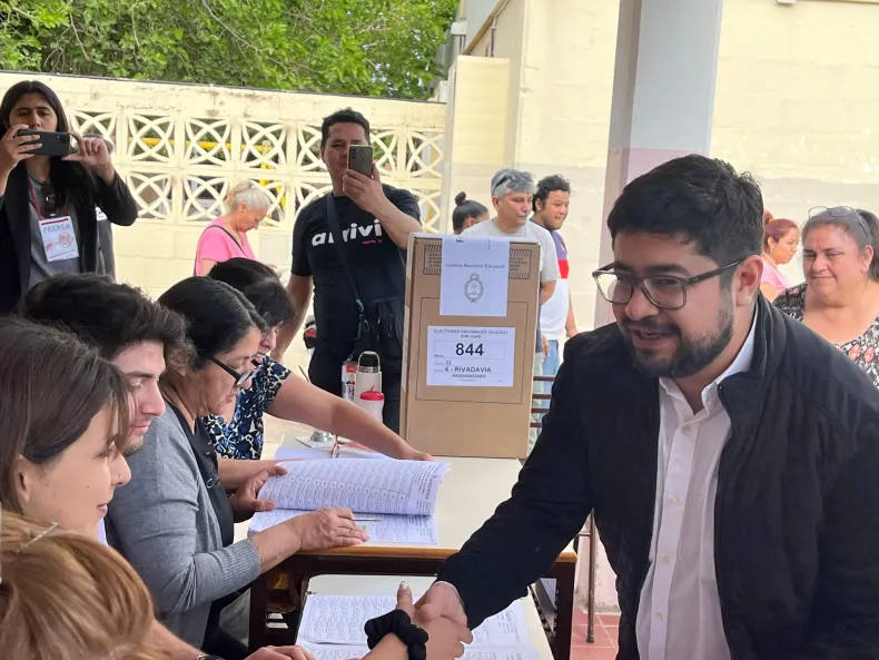 El candidato al Parlamento del Mercosur (Parlasur) por Unión por la Patria Matías Sotomayor, votó en la escuela Diógenes Perramón, en La Bebida, Rivadavia.