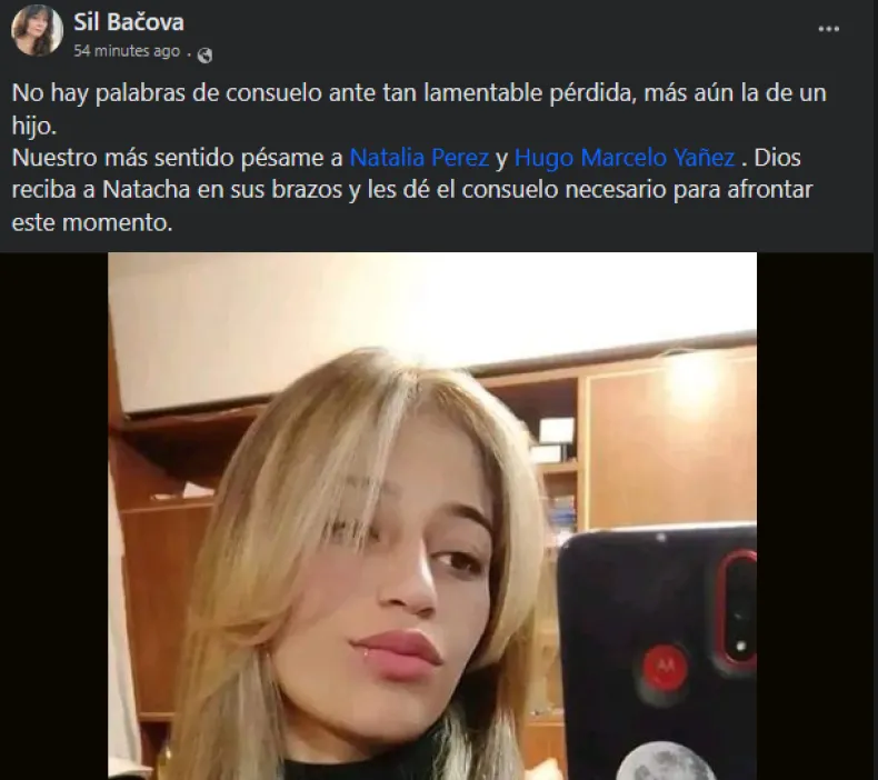 Otra publicación expresa: "No hay palabras de consuelo ante tan lamentable pérdida, más aún la de un hijo. Nuestro más sentido pésame a Natalia Perez y Hugo Marcelo Yáñez. Dios reciba a Natacha en sus brazos y les dé el consuelo necesario para afrontar este momento."