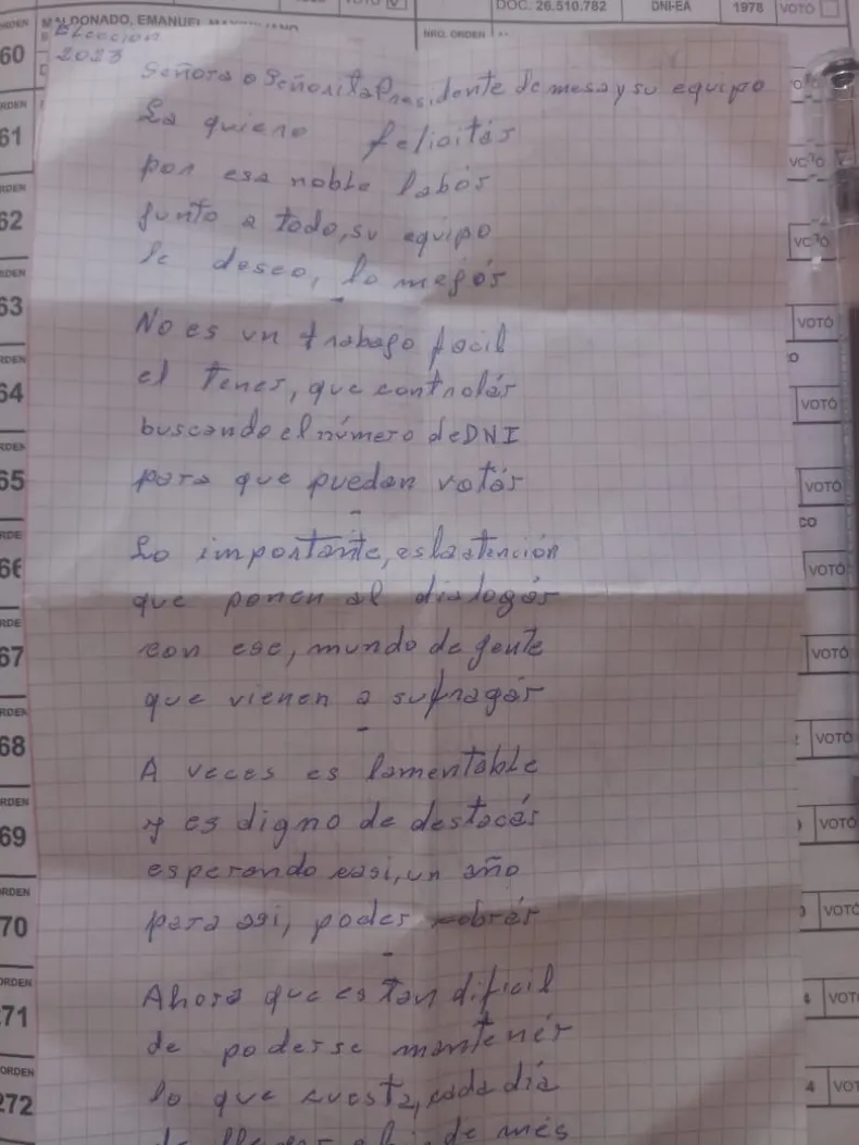 Un hombre entró a votar y al salir del cuarto oscuro le dedicó una poesía a todas las autoridades de mesa. El insólito hecho ocurrió en la Escuela Provincia de Mendoza.