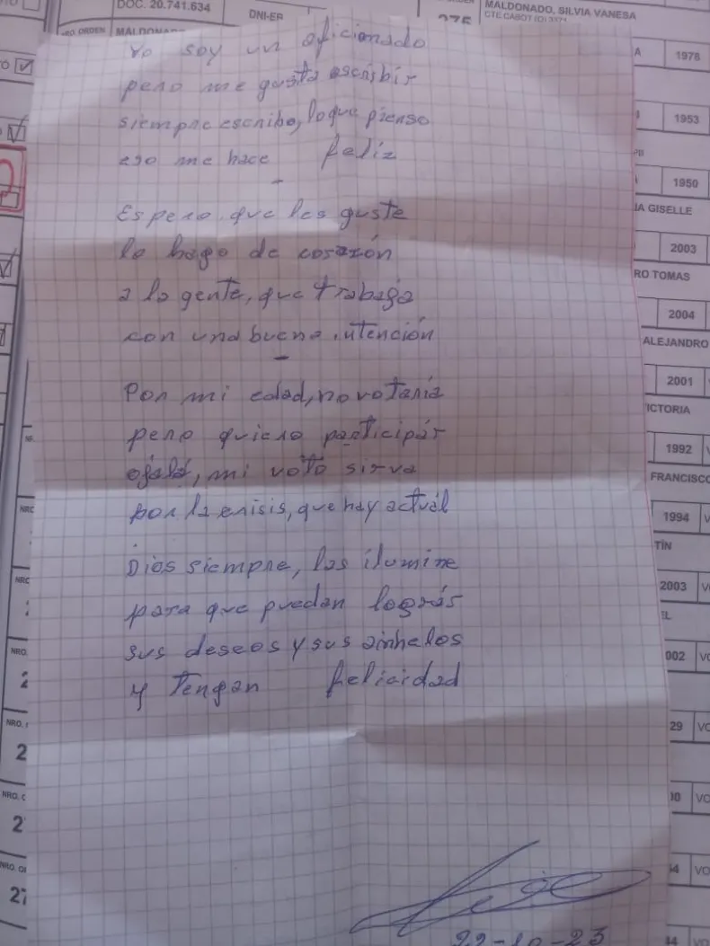 El hecho sucedió en el establecimiento de la Escuela Provincia de Mendoza, en Rivadavia. Un sanjuanino llegó a votar y al salir del cuarto oscuro, luego de echar su voto a la urna, les regaló un poema escrito a mano a las autoridades de mesa.
