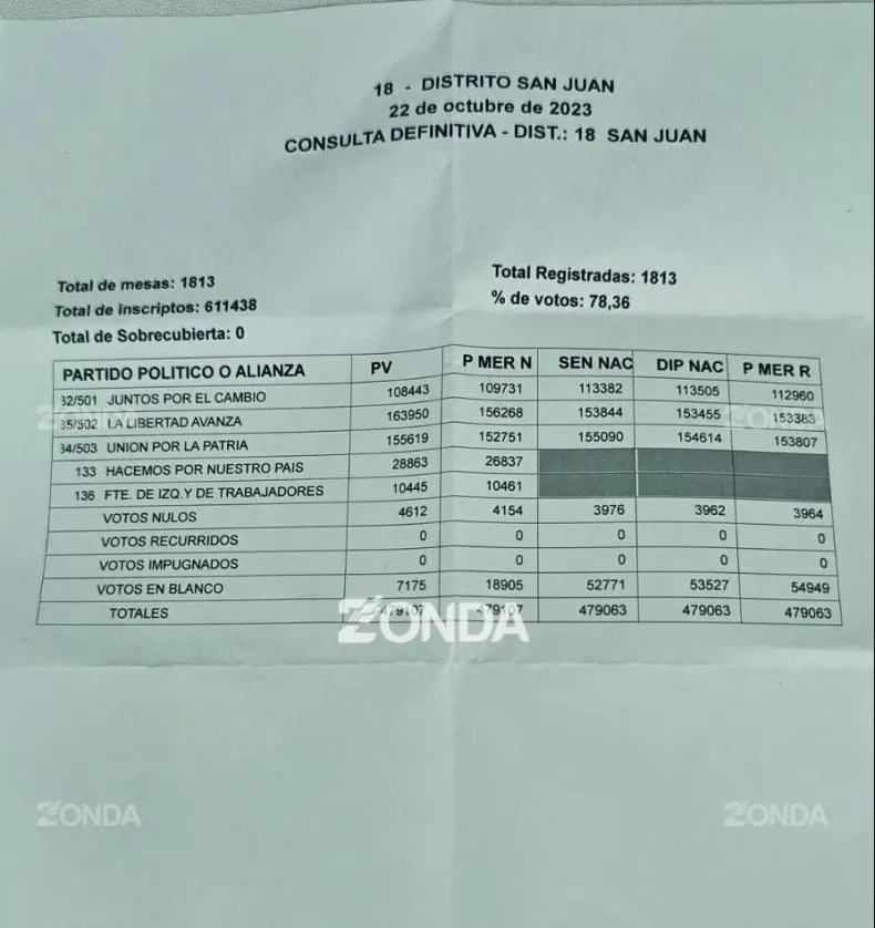 También, se revirtió en la categoría de presidente y vice, poniendo a Javier Milei como el más votado en San Juan. Logró 163.950 votos ante los 155.619 que obtuvo Massa, registrando una diferencia de 8.331 votos a favor del libertarios. Eso significa que hubo mucho corte de boletas que no permitieron el triunfo en categorías provinciales de los referentes de LLA.