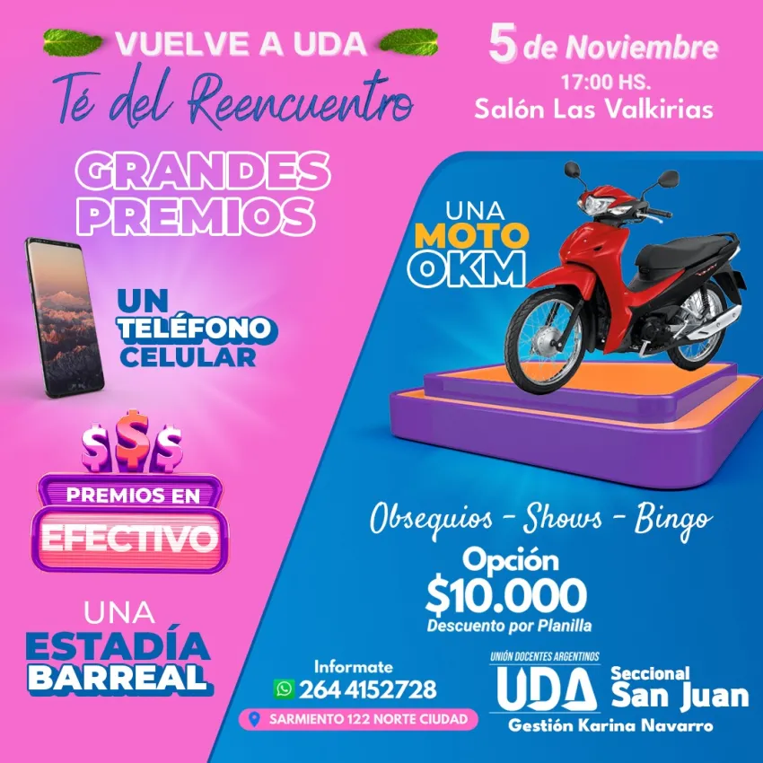 UDA (Unión Docentes Argentinos) Seccional San Juan, gestión Karina Navarro, realizará el domingo 5 de noviembre desde las 17 horas el té del reencuentro en el Salón Las Valkirias, ubicado en Ignacio de la Roza 1467, Rivadavia.