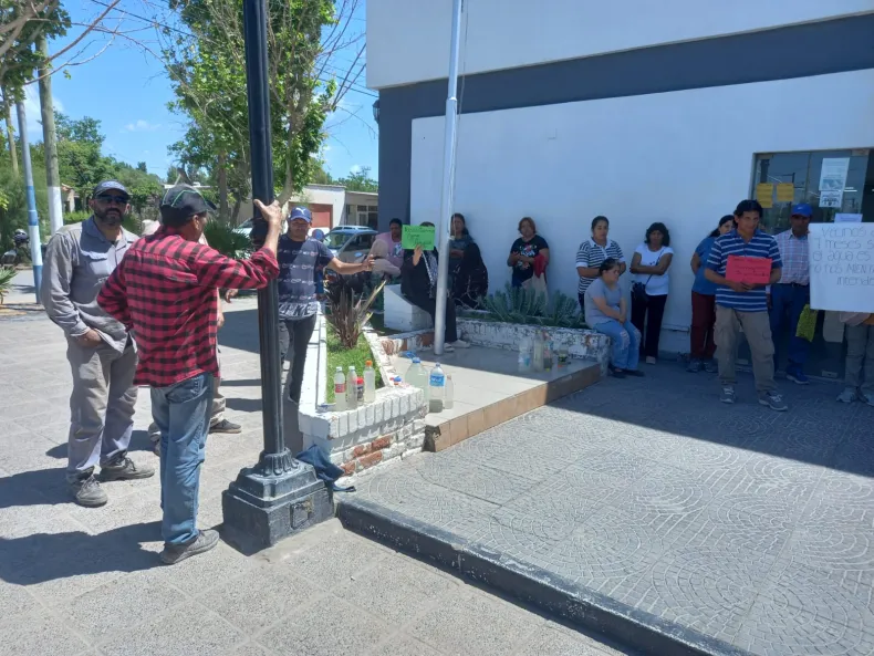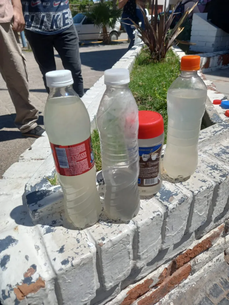 Cansados de falsas promesas, los laguneros no llegaron con las manos vacías, sino que lo hicieron con varias botellas de agua, para que el intendente vea la calidad del agua que están recibiendo los vecinos de esa zona de Sarmiento.