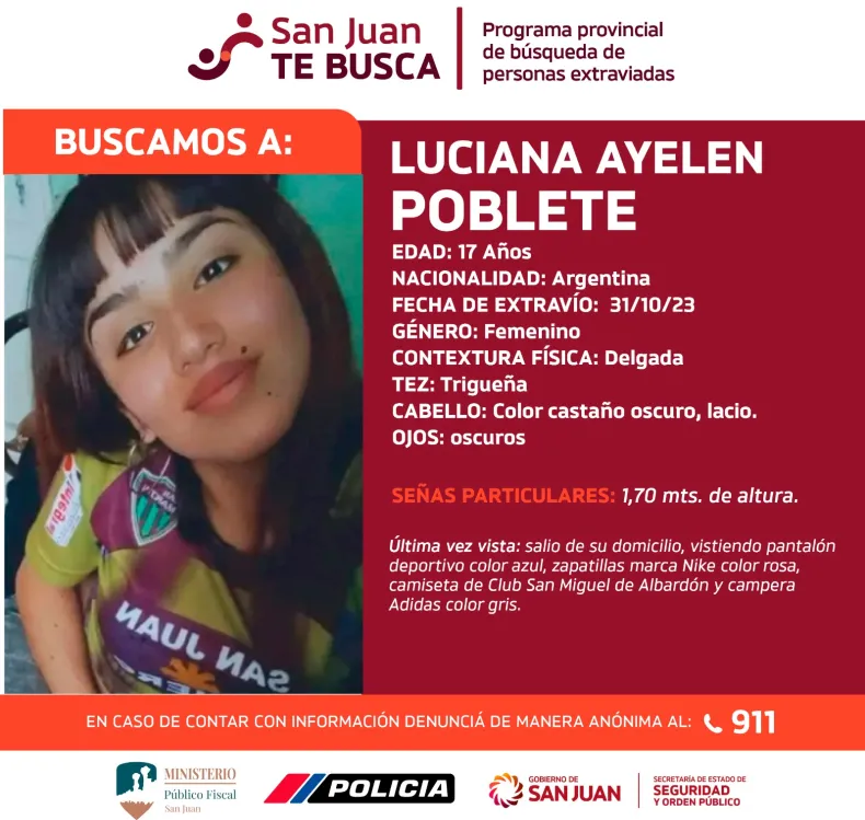La chica que es intensamente buscada fue identificada como Luciana Ayelén Poblete (17), quien salió de su casa del departamento Albardón el pasado 31 de octubre y ya lleva tres días de desaparecida y hasta el momento no se ha comunicado con su familia, por lo que ha provocado una angustia a todos sus familiares.