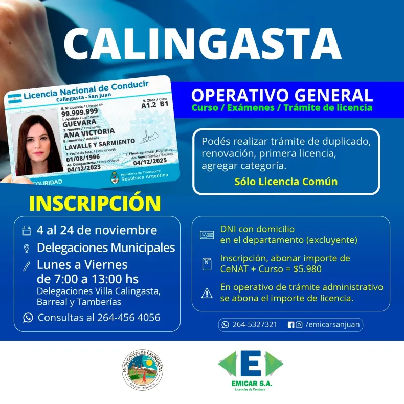 Emicar, la empresa que administra los servicios de tránsito en la provincia de San Juan, continúa realizando operativos para que los sanjuaninos puedan sacar su licencia de conducir. En esta oportunidad, los próximos cursos se llevarán a cabo en Pocito, Caucete y Calingasta.