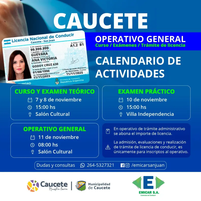 En tanto, en Caucete el curso y examen teórico será el 7 y 8 de noviembre a las 15 horas en Salón Cultural (obligatorio asistir en fecha indicada al inscribirse). Por su parte, el examen práctico es el 10 de noviembre a las 15 en Villa Independencia.