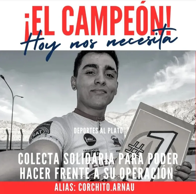 Inició la temporada de ruta en ciclismo, con una primera fecha accidentada. Es que Nicolás "Corchito" Arnau, de 20 años, sufrió un violento choque a la altura del Paredón del Dique de Ullum y padeció de lesiones considerables. Permanece internado y necesita de insumos costosos. Por ello, allegados y familiares acudieron a la solidaridad.