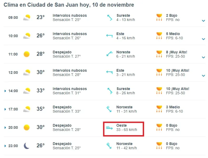 La alerta abarca todo el territorio provincial y se extenderá hasta el sábado. Según el sitio especializado Meteored, pasadas las 13, las ráfagas comenzarían a sentirse en el Gran San Juan y con el pasar de las horas irá aumentando la intensidad. En tanto, a las 20 horas se esperan ráfagas con una intensidad mayor de 60 km/h.