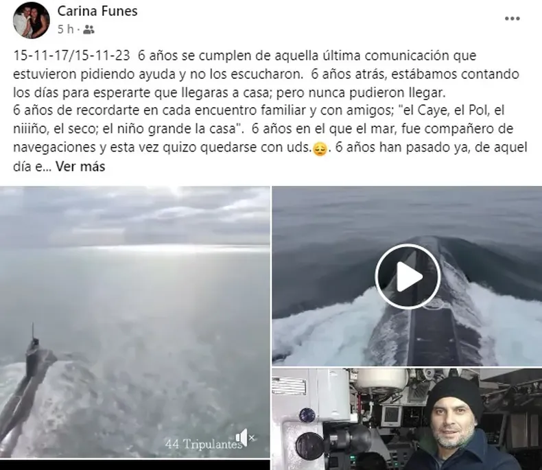 Tras ese triste suceso, la esposa de uno de los tripulantes sanjuaninos expresó su dolor en las redes y recordó a su esposo fallecido en la tragedia. Carina Funes utilizó las redes sociales para dejar plasmado el recuerdo y dolor por Cayetano Vargas, el angaquero que desapareció junto a sus 43 compañeros.