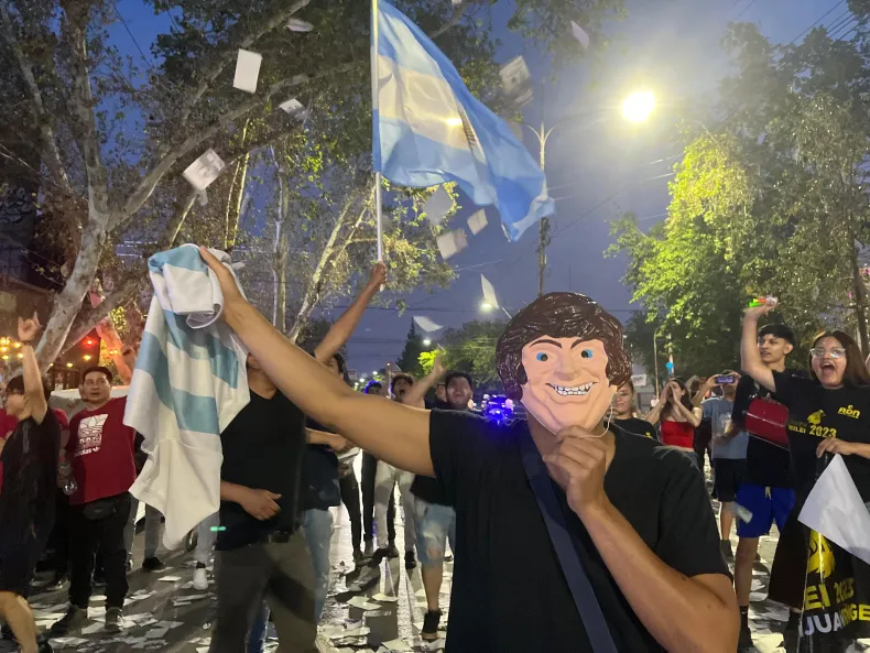 Debido a esto, en el búnker de La Libertad Avanza de San Juan que está ubicado en Av. Libertador, ciento de sanjuaninos festejaron con papeles, bombos, cornetas y hasta máscara del libertario.