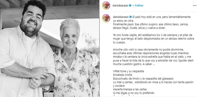 El reconocido conductor y humorista Darío Barassi se encuentra atravesando un difícil momento personal con la partida de su madre, Laura, quien perdió la vida el pasado domingo por la tarde tras una valiente batalla contra el cáncer de páncreas. Barassi compartió la triste noticia y le rindió emotivo tributo a través de sus redes sociales, donde cuenta con una audiencia de cuatro millones y medio de seguidores.