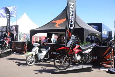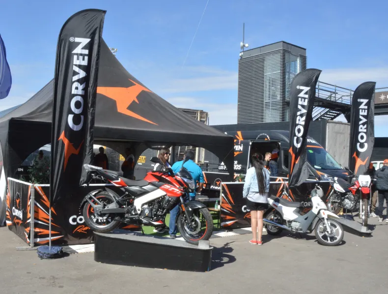 Mientras los niños que pasan por el stand se llevan los globos color naranja, los mayores se quedan consultando por los productos exhibidos entre ellos las motos CORVEN.