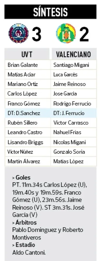 UVT se quedó con el primer partido de la final del Torneo Clausura A1 al vencer a Centro Valenciano 3 a 2. Carlos López y Franco Gómez por dos marcaron para el comunitario. El miércoles se juega el segundo partido en el Cantoni
