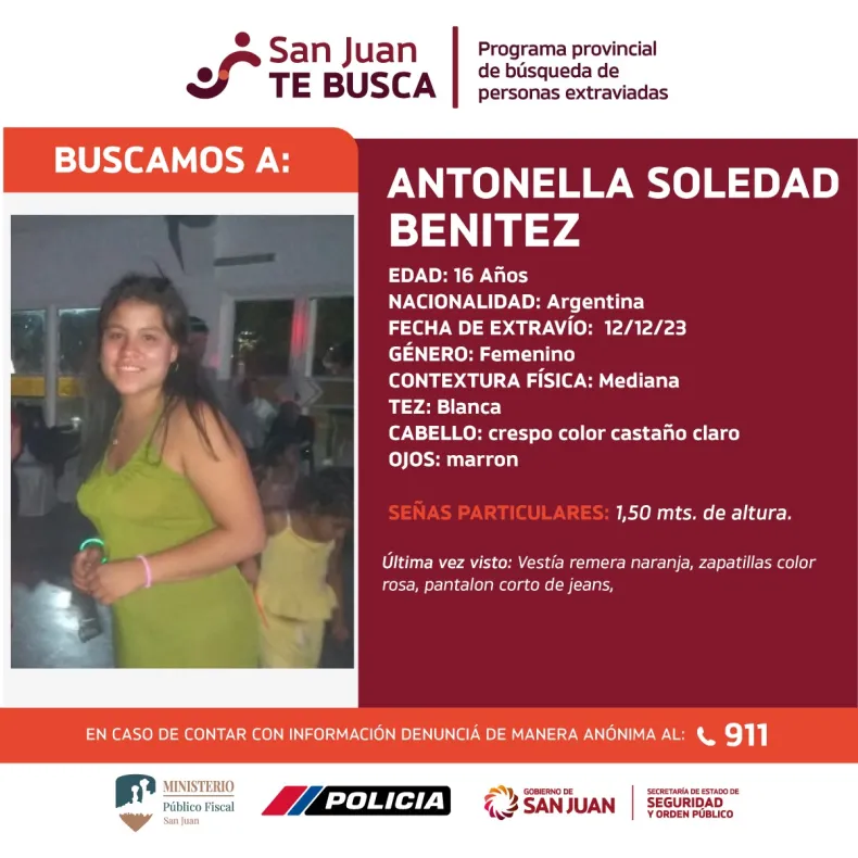 Varias comisiones policiales entre ellas la oficina Búsqueda de Personas, a través del programa "San Juan te Busca", se encuentran trabajando para dar con el paradero de la menor Antonella Soledad Benítez (16), que salió de su casa y hasta el momento su paradero es incierto.