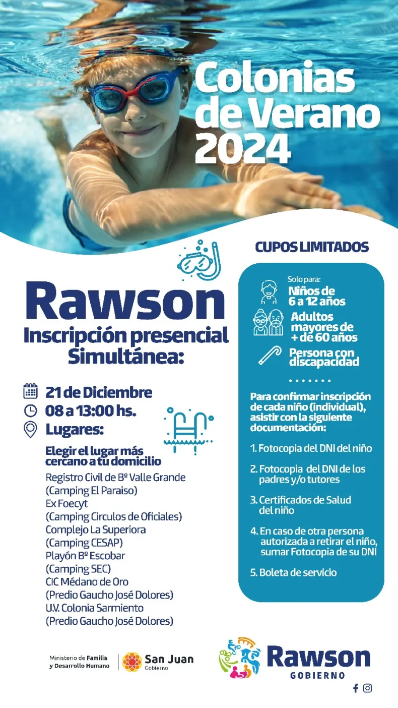 La Municipalidad de la Ciudad de Rawson informa el inicio de las inscripciones para las Colonias de Verano 2024, destinadas a niños y niñas de 6 a 12 años, adultos mayores y personas con discapacidad.