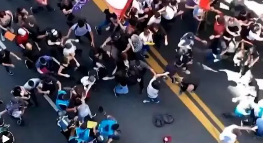 Manifestantes se enfrentan con la Policía de la Ciudad en la marcha piquetera en el centro porteño. El incidente se produjo sobre Diagonal Norte, mientras el presidente Milei monitorea el operativo desde el Departamento Central de la Policía Federal.