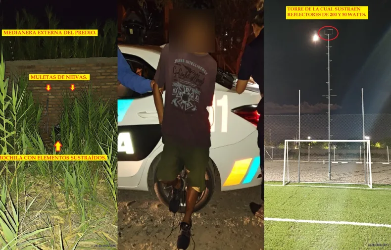 Según los informes, los detenidos ingresaron al predio del damnificado, violando medidas de seguridad. Durante el incidente, vandalizaron la zona de la cantina y sustrajeron diversos elementos, incluyendo cableado eléctrico, llaves térmicas, luminarias fluorescentes y extractores de aire de los baños.