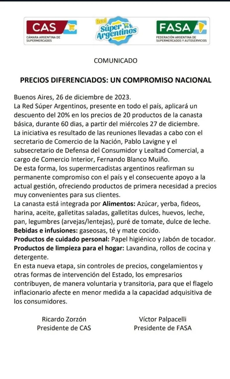 El objetivo del sector es paliar la baja de ventas que se generó a partir de la quita de controles y el aumento exponencial de algunos productos."De esta forma, los supermercadistas argentinos reafirman su permanente compromiso con el país y el consecuente apoyo a la actual gestión, ofreciendo productos de primera necesidad a precios muy convenientes para sus clientes", agregaron en el escrito.