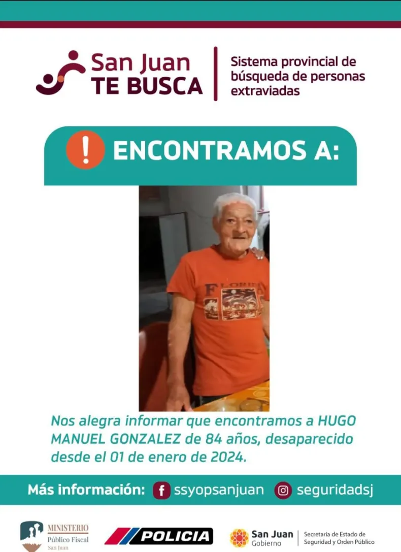 Durante la siesta de este martes, desde San Juan Te Busca dieron a conocer que Hugo Manuel González, el abuelo de 83 años con Alzheimer que estaba siendo intensamente buscado por su familia y la policía, fue encontrado.